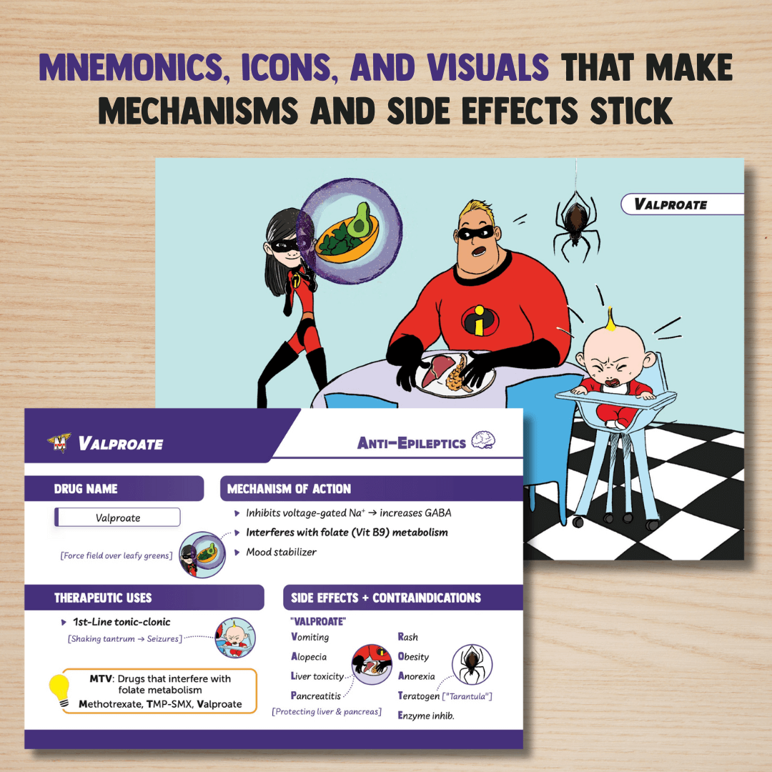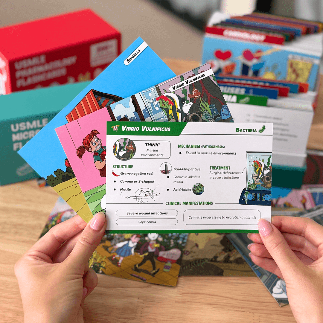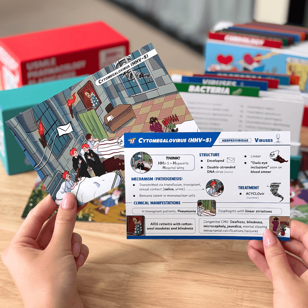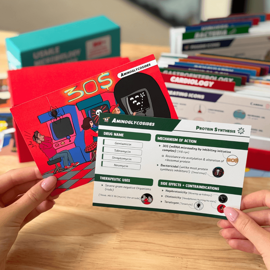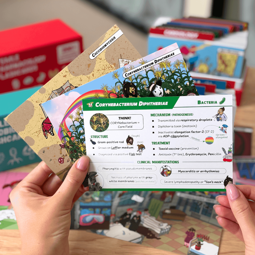 Each card focuses on mechanism/pathogenesis, structural characteristics, clinical manifestations and treatment.To maximize retention, we’ve incorporated custom MedSchoolBro Scenes with many pop-culture references: