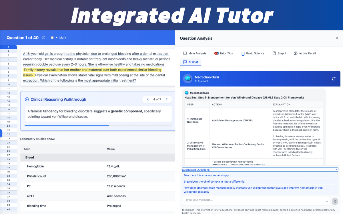 - Integrated AI Tutor — trained on USMLE content to give instant explanations and study guidance.