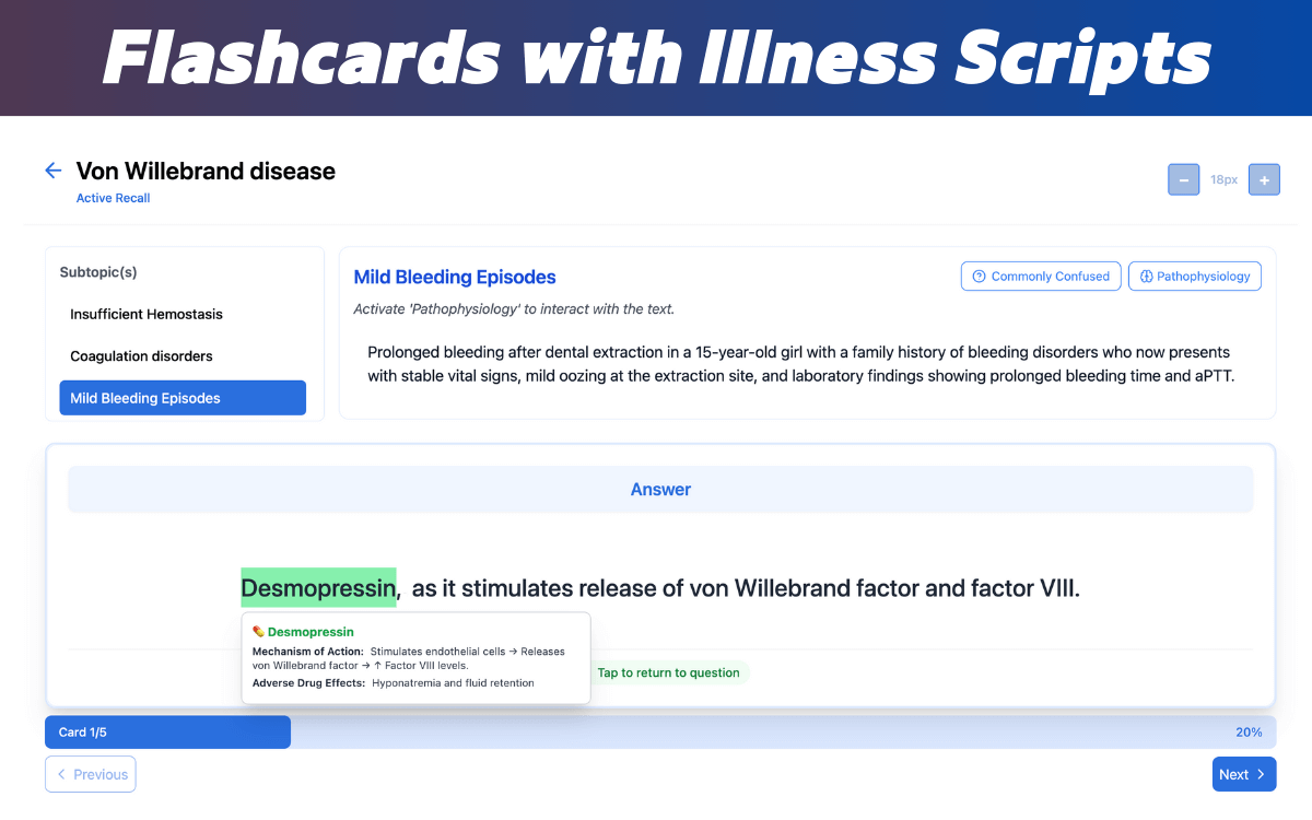 - Adaptive learning, where each block feeds you the active recall flashcards, illness scripts, mnemonics, and eBook sections you need next